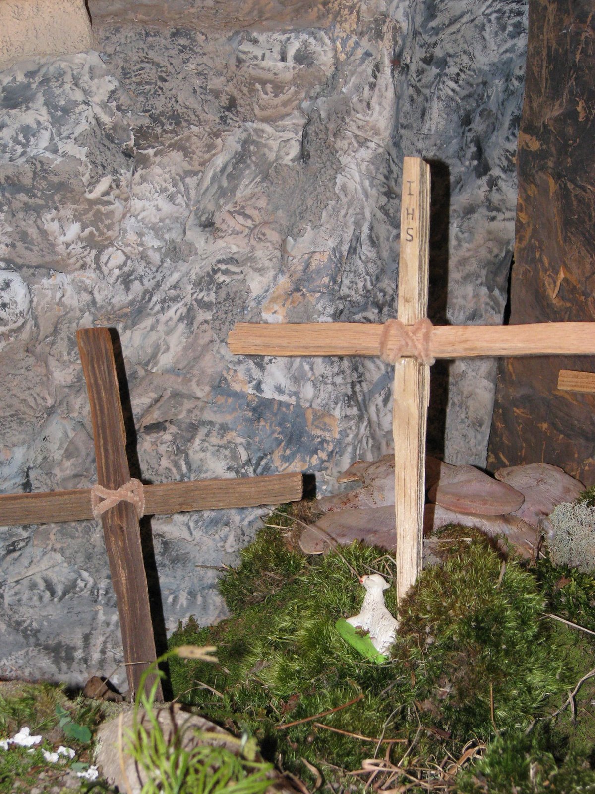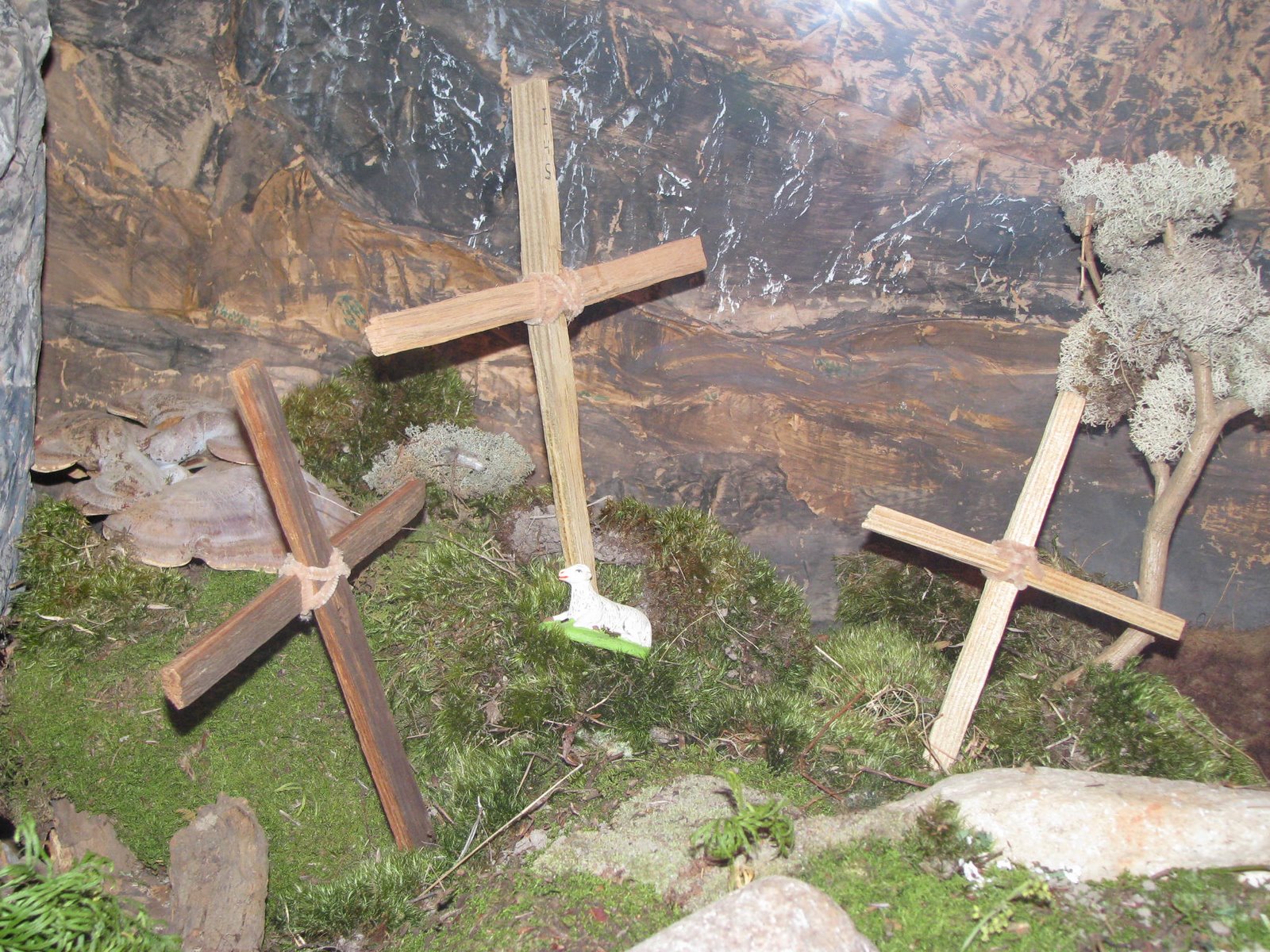 The crosses after the crucifixions. The lamb remains reminding us that Jesus is the Lamb of God and the Good Shepherd.