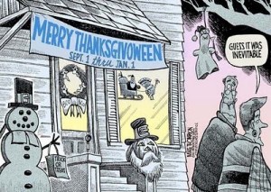 Advent lasts 4 weeks and is followed by Christmas–a season 12 days long that starts on the eve of December 25th. But we’re not there yet, even though it’s hard to tell by looking outside. I have been hyper-aware of Christmas preparations this year. I found it downright disturbing to see Christmas Trees and decorations for sale during the 2nd week of OCTOBER. And the wreaths were hung by the shop buildings with care–before Halloween. It seems that in years past Thanksgiving was overshadowed by Christmas Shopping, but this year, even Halloween got overshadowed. Really? Halloween. Do we need to make the commercialization of Christmas last over 2 months? Will “Merry New Thanksgive-o-ween!” become the new standard holiday greeting?