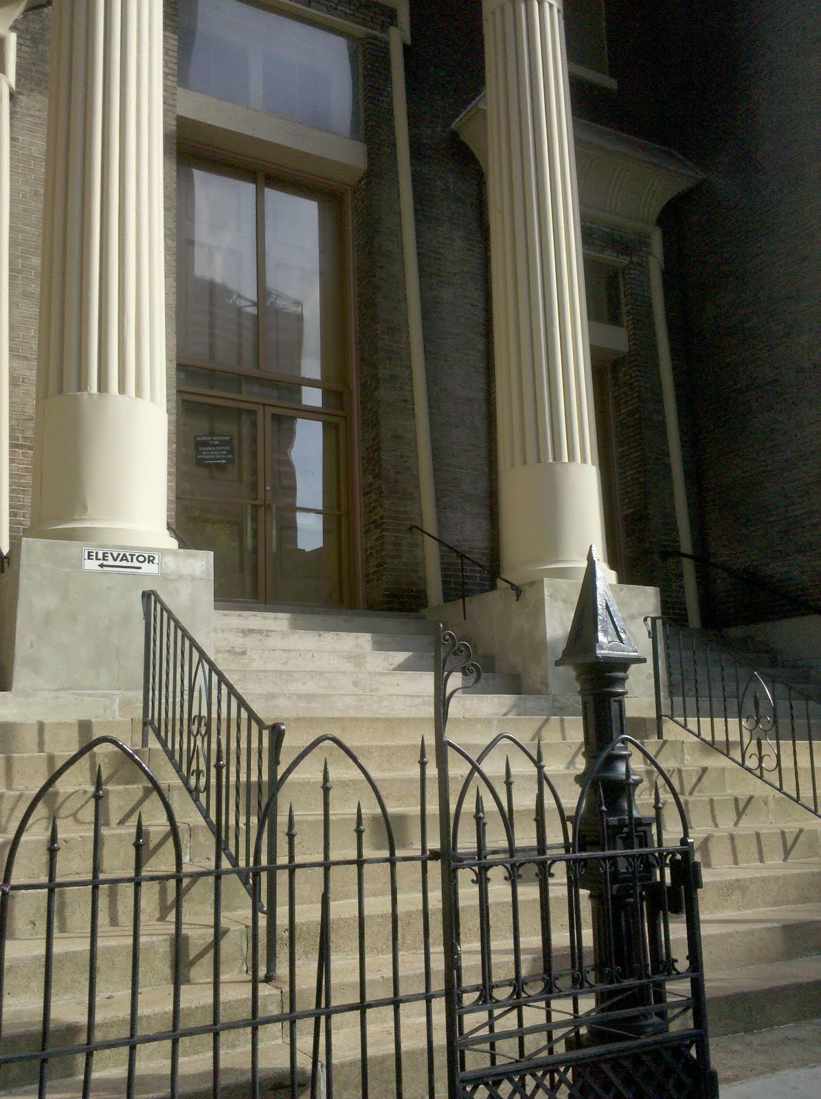 These are the front steps and front door for First Presbyterian Church. It and McKendree United Methodist were on Church Street. They were about a block up from my hotel. Both front facades are neo-classical in design. I forgot to take a photo of the UMC building.