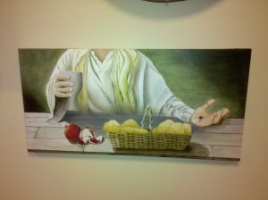 Inside First Baptist they had all types of art in the hallways. This was a painting that was near the offices where I sat to check email one day. It’s of a Post-Resurrection picnic. I love the basket with bread, the chalice cup, and an apple (or pomegranate) that appear on the picnic table. It’s clear that it is Christ by the stigmata (nail hole) on his hand. Though he’s painted a little to racially white to be a Middle Eastern Jew (I’ll stay off this soapbox for now), I do like the mystery of the image. It is as if the viewer is being invited to dine at the table with Christ. Christ bids us come to the table and feast…