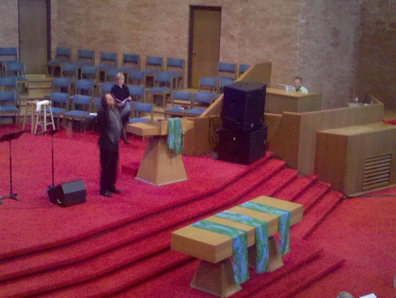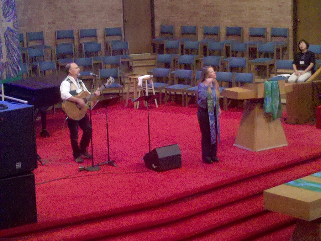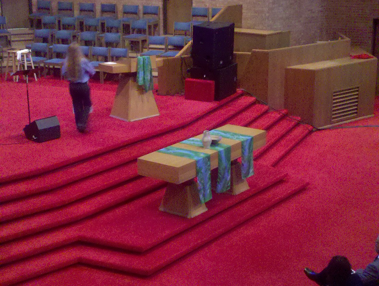 This is Susan Phillips preparing for the opening worship in the morning. One of the vendors who had liturgical art available for sale lent the Festival various pieces from her collection that were handmade. The Communion Table and Pulpit here are covered in hand colored silks. They were beautiful and it was nice having the banners and art change each day and sometimes for each worship gathering.