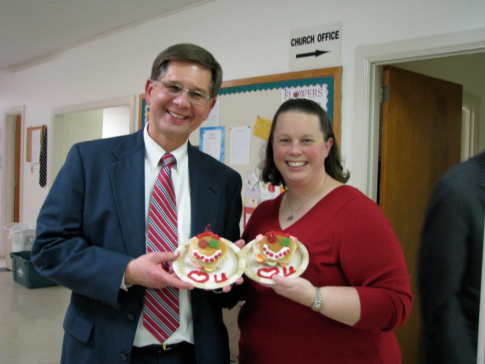 | [Pastors Craig and Suzanne with our Decorated Lovefeast Buns from Christmas 2009.] |